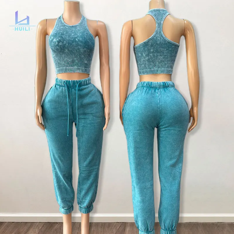 Huili Custom 3 Piece Vintage Acid Wash Outfits tank Top Half Zip Sweatshirt Joggers Y2k Matching Set Activewear Sets for Women